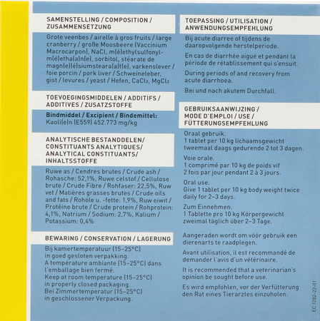 Samenstelling: Grote veenbes, NaCl, MSM, sorbitol, magnesiumstearaat, varkenslever, gist, CaCl2, MgCl2, Kaolien.