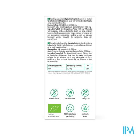 Purasana Spirulina Bio Tabl 180 is een voedingssupplement, verkrijgbaar in uw buurtapotheek of online apotheek. Neem niet meer dan de aanbevolen dagelijkse dosis vermeld op de verpakking. Het vervangt geen gezonde levensstijl en gevarieerde en evenwichtige voeding. Vraag raad aan uw apotheker. Het product altijd buiten het bereik van kinderen houden.