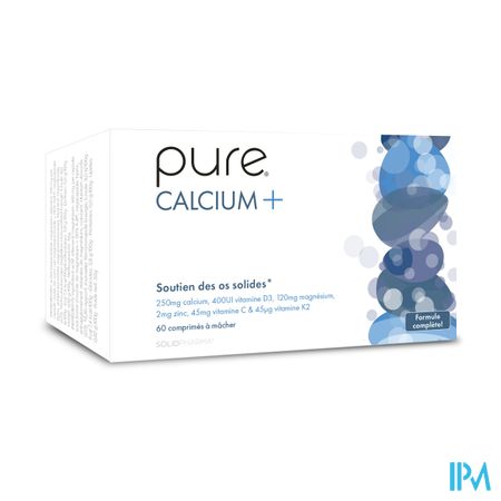 - Pure Calcium+ bestaat uit calcium met de belangrijkste calciumsynergisten, een combinatiepreparaat dat werkt via verschillende mechanismen (als componenten van het bot, invloed op osteoblasten en osteoclasten, invloed op calciumhomeostase, invloed op spierkracht, als essentiële cofactor van eiwitten in botstabiliteit)