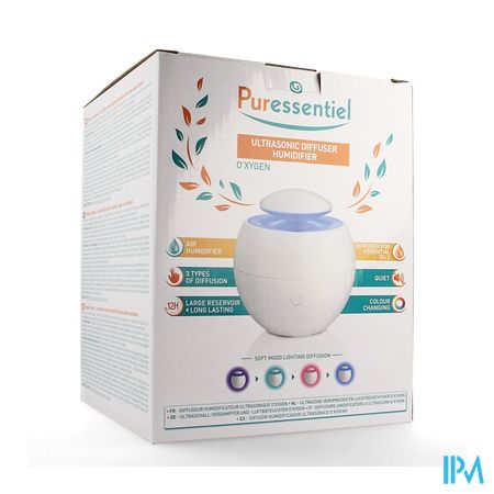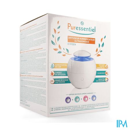 Ultrasone verspreider en luchtbevochtiger O'xygen van Puressentiel®, is uitgerust met een ultrasoon verdampsysteem dat zorgt voor een lichte verneveling met of zonder essentiële oliën.