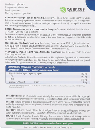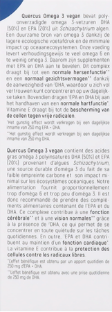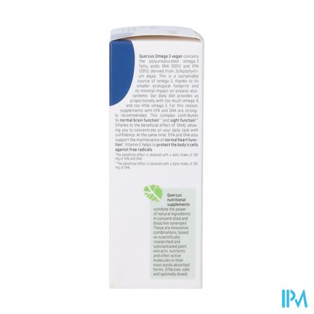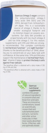 Quercus Omega 3 vegan bevat poly-onverzadigde omega 3-vetzuren DHA (50%) en EPA (20%) uit Schizochytriumalgen. Een duurzame bron van omega 3 dankzij de lagere ecologische voetafdruk en de minimale impact op oceaanecosystemen. Onze voeding levert verhoudingsgewijs te veel omega 6 en te weinig omega 3. Daarom zijn supplementen met EPA en DHA aan te bevelen. Dit complex draagt bij tot een normale hersenfunctie** en een normaal gezichtsvermogen** dankzij de aanwezigheid van 2DHA, waardoor u zich vol vertrouwen kunt concentreren op uw dagelijkse taken. Bovendien dragen 1EPA en DHA bij aan het handhaven van een normale hartfunctie*. Vitamine E draagt bij tot de bescherming van de cellen tegen vrije radicalen.