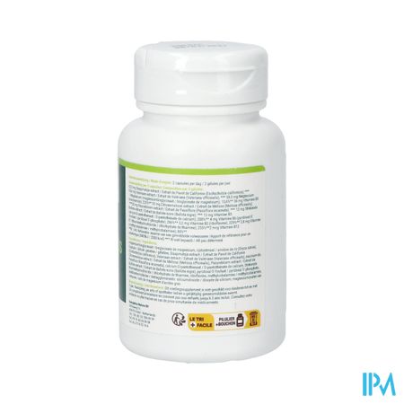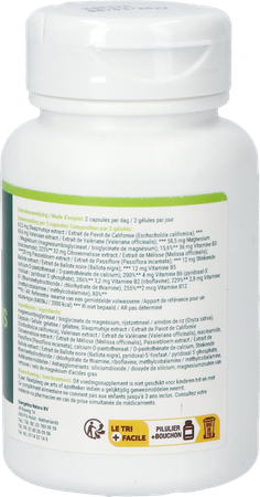 valeriaan, stinkende ballote extract, slaapmutsje, passiebloem, citroenmelisse, magnesiumbisglycinaat, niacinamide , calcium-d-pantothenaat, pyridoxaal-5'-fosfaat, riboflavine, thiaminehydrochloride, methylcobalamine, capsule: gelatine, water, glycerine, vulstof: rijstebloem, anti-klontermiddel: magnesiumstearaat, siliciumdioxide
