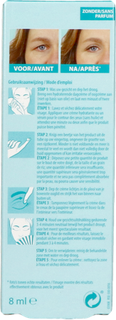 STAP 5: Breng de crème zachtjes met de vingertop rechtstreeks aan op de plooi van je bovenste ooglid: begin bij de binnenhoek van uw oogplooi en beweeg over de plooi naar de buitenhoek toe. Wrijf de crème zo nodig ook wat hoger uit, naar de wenkbrauw toe. Zorg ervoor dat je de crème niet op het bewegende deel van uw bovenste ooglid en niet te dicht bij je oog aanbrengt, want het product spreidt zich verder uit naarmate het opwarmt door je lichaamstemperatuur.