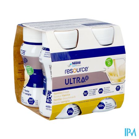 Resource Ultra+ is een eiwit‐ en energierijke voeding. Een flesje van 125ml bevat 20 g wei‐eiwitten (28% kcal) en 281 kcal (2,25 kcal/ml). Voeding voor medisch gebruik bij ondervoeding of risico op ondervoeding bij volwassenen.