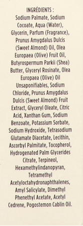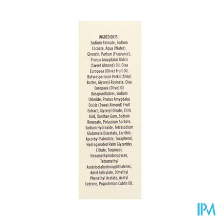 Natriumpalmaat, Natriumcocoaat, Aqua (Water), Glycerine, Prunus Amygdalus Dulcis (Zoete Amandel) Olie, Olea Europaea (Olijf) Fruitolie, Parfum (Geur), Butyrospermum Parkii (Shea) Boter, Glyceryl Rosinate, Olea Europaea (Olijf) Olie Onverzeepbare bestanddelen, Natriumchloride, Prunus Amygdalus Dulcis (Zoete Amandel) Fruitextract, Ficus Carica (Vijg) Fruitextract, Citroenzuur, Xanthaangom, Natriumbenzoaat, Kaliumsorbaat, Glyceryl Oleaat, Natriumhydroxide, Tetranatriumglutamaat Diacetaat, Lecithine, Ascorbyl Palmitaat, Tocoferol, Gehydrogeneerde Palm Glyceriden Citraat, Hexamethylindanopyran, Dimethyl Fenethyl Acetaat