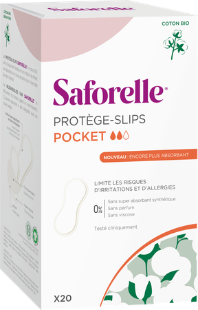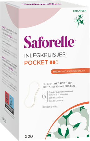 Saforelle biedt alle vrouwen die op zoek zijn naar een veilige en zachte hygiënische bescherming die de intieme zone respecteert, de hypoallergenePocket BIO inlegkruisjes, die borg staan voor een menstruatie in alle veiligheid en zachtheid. De pocket inlegkruisjes zijn discreet, praktischen neemt u makkelijk overal mee. Vergeet ze niet in uw handtas of sporttas te stoppen!