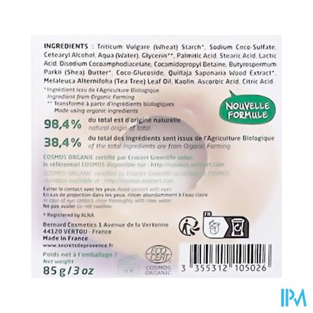 Ingrediënten: Triticum Vulgare (Tarwe) Zetmeel*, Natriumcocosulfaat, Cetearylalcohol, Aqua (Water), Glycerine**, Palmitinezuur, Stearinezuur, Melkzuur, Dinatriumcocoamfodiacetaat, Cocamidopropylbetaïne, Butyrospermum Parkii (Shea) Boter*, Coco-Glucoside, Quillaja Saponaria Houtextract*, Melaleuca Alternifolia (Tea Tree) Bladolie, Kaolien, Ascorbinezuur, Citroenzuur