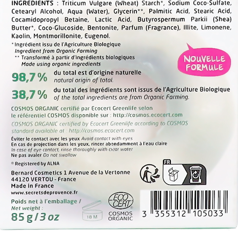 Ingrediënten: Triticum Vulgare (Tarwe) Zetmeel*, Natriumcocosulfaat, Cetearylalcohol, Aqua (Water), Glycerine**, Palmitinezuur, Stearinezuur, Cocamidopropylbetaïne, Melkzuur, Butyrospermum Parkii (Shea) Boter*, Coco-Glucoside, Bentoniet, Parfum (Geur), Illiet, Limoneen, Kaolien, Montmorilloniet, Eugenol