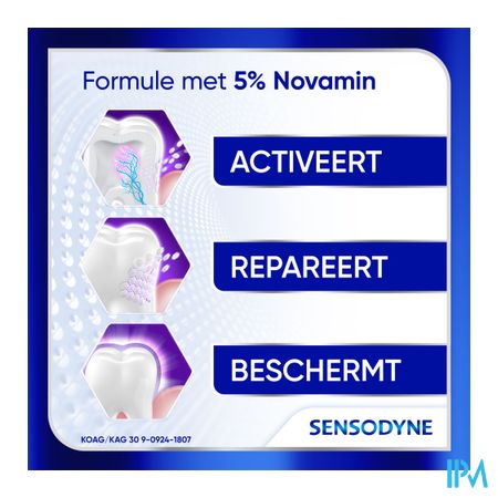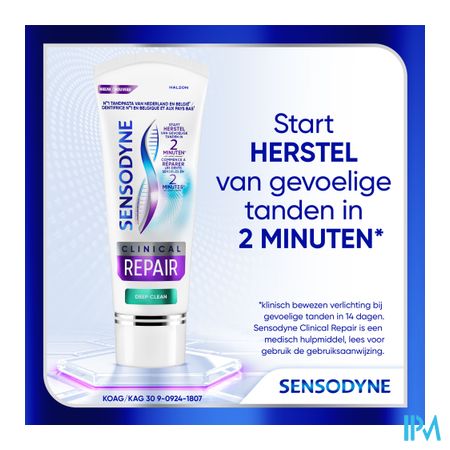 Sensodyne Clinical Repair Deep Clean is een dagelijkse fluoride tandpasta voor gevoelige tanden. De formule met 5% Novamin vormt een beschermende laag over de gevoelige gedeeltes van de tand en beschermt zo tegen gevoeligheid.