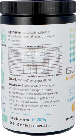 Sport Isotone Energy Agrum Drink700g Pharmanutrics is een voedingssupplement, verkrijgbaar in uw buurtapotheek of online apotheek. Neem niet meer dan de aanbevolen dagelijkse dosis vermeld op de verpakking. Het vervangt geen gezonde levensstijl en gevarieerde en evenwichtige voeding. Vraag raad aan uw apotheker. Het product altijd buiten het bereik van kinderen houden.