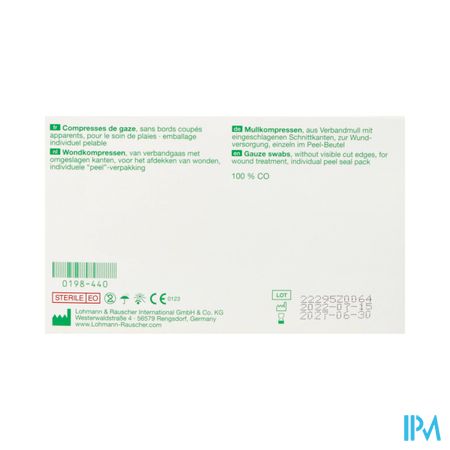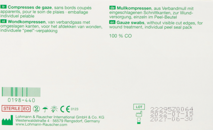 in een zachte of harde blisterverpakking die zich zeer makkelijk laat openen, zonder dat er losse vezeltjes vrijkomen en gesteriliseerde kompressen met verschillende afmetingen en lagen, met of zonder bariumdraad
