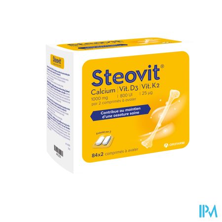 Steovit Calcium/vitd3/vit K2 1000mg/880iu Comp2x84 is een voedingssupplement, verkrijgbaar in uw buurtapotheek of online apotheek. Neem niet meer dan de aanbevolen dagelijkse dosis vermeld op de verpakking. Het vervangt geen gezonde levensstijl en gevarieerde en evenwichtige voeding. Vraag raad aan uw apotheker. Het product altijd buiten het bereik van kinderen houden.
