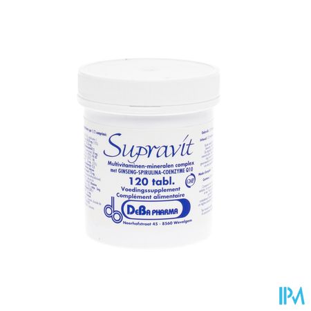 Supravit is een multivitaminen-mineralen preparaat die uw algemene tekorten aan vitaminen en mineralen aanvult. Een dagelijkse aanvulling met Supravit is dan ook primordiaal voor een goede energiehuishouding. Dit hooggedoseerd multivitaminen-mineralen complex is aangevuld met extra Ginseng, Coenzyme Q10 en Spirulina. Ook sporters hebben veelal nood aan een extra aanvulling om topprestaties te kunnen leveren.