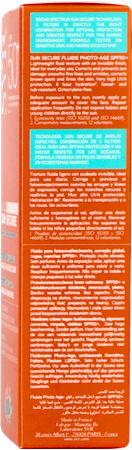 Een lichte vloeistof met een onzichtbare finish om de tekenen van fotoveroudering dagelijks te corrigeren en te voorkomen. Sun Secure Fluide Photo-Age SPF50+ combineert een zeer hoge versterkte dermatologische breedspectrum- en UVA-bescherming* met antiverouderende actieve ingrediënten om fijne lijntjes en rimpels glad te strijken, pigmentvlekken te corrigeren en de huid te verstevigen. Parfumvrije formule.