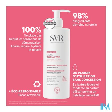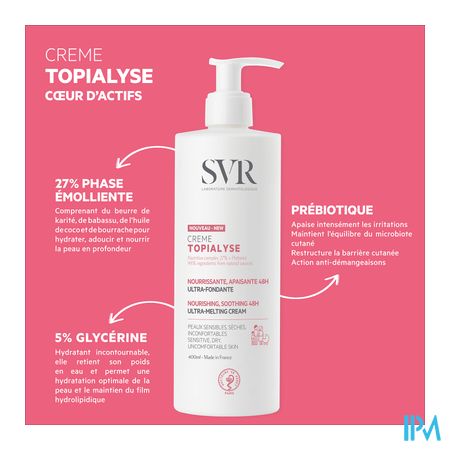 Geschikt voor de kwetsbare huid van kinderen en aanstaande moeders. TOPIALYSE Crème is HET verzorgingsproduct voor de droge en gevoelige huid voor het hele gezin. Een verzachtende en voedende formule om afscheid te nemen van gevoelens van benauwdheid voor onmiddellijk en langdurig comfort.