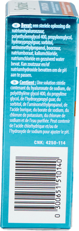 Natriumhyaluronzuur, polyethyleenglycol 400, propyleenglycol, hydroxypropylguar, sorbitol, aminomethylpropanol, boorzuur, natriumboraat, kaliumchloride, natriumchloride en gezuiverd water bevat. Kan zoutzuur en/of natriumhydroxide bevatten om de pH aan te passen.