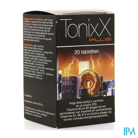 2 tabletten TonixX PLUS bevatten 1500mg acetyl-L-carnitine, 100 mg co-enzym Q10, 1,1 mg vitamine B1 (100% RI), 1,4 mg vitamine B2 (100% RI), 16 mg vitamine B3 (100% RI), 6 mg vitamine B5 (100% RI), 1,4 mg vitamine B6 (100% RI), 2,5 µg vitamine B12 (100% RI), 200 µg foliumzuur (100% RI), 50 µg biotine (100% ADH) en 10 mg zink (100% RI, onder vorm van bisglycinaat, een moderne, goed opneembare vorm).