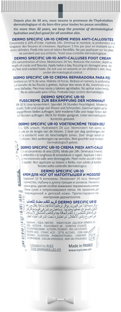 Zeer droge voeten en gekloofde hielen. Hydrateert 24 uur en herstelt intens. Vooral aanbrengen op de beschadigde zones. Niet aanbrengen op wonden of de huid van kinderen. Getest onder dermatologisch toezicht. Zonder parabeen.