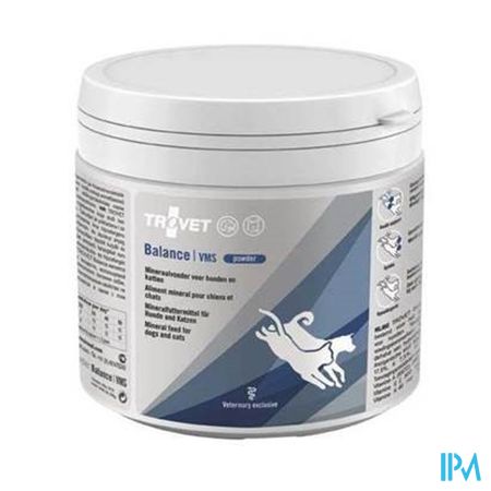 TROVET Balance VMS is een aanvullende, hypoallergene vitamine- en mineralenmix voor honden en katten met huidklachten of een nutriënten tekort bij het volgen van een niet-volledige of zelf-samengestelde (dieet)voeding. Een uitgebalanceerde voeding met alle voedingsstoffen, vitaminen en mineralen die de hond of kat nodig heeft, stimuleert een gezonde huid en vacht. Als men er voor kiest de voeding van de hond of kat zelf samen te stellen, komt het vaak voor dat het dier net wat meer nodig heeft om zijn optimale conditie te verkrijgen en te behouden. Bij een niet-volledige (dieet) voeding of bij het zelf samenstellen van een (eliminatie) dieet is TROVET Balance VMS een goede manier om de benodigde vitaminen en mineralen van het dier, in optimale verhouding, aan te vullen. TROVET Balance VMS is een hypoallergeen product. Dit betekent dat honden en katten die een samengesteld dieet krijgen door voedselgerelateerde dermatose (huidklachten) of een overgevoeligheid hebben, dit product kunnen gebruiken.