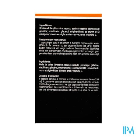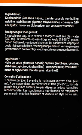100 mg co-enzym Q10, koolzaadolie, gelatine, glycerine, water, lecithine, cellulose, antioxidant (D-alfa-tocoferol), ethylvanilline.
