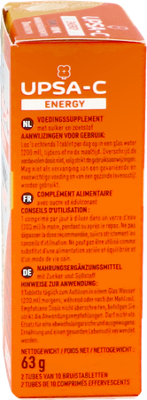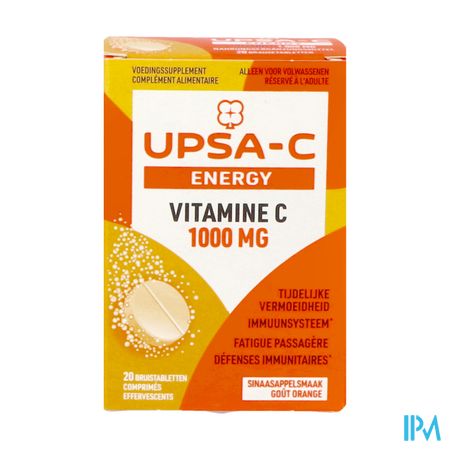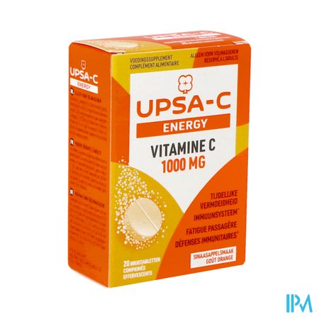 Upsa C Energy 1000mg Bruistabl 20 is een voedingssupplement, verkrijgbaar in uw buurtapotheek of online apotheek. Neem niet meer dan de aanbevolen dagelijkse dosis vermeld op de verpakking. Het vervangt geen gezonde levensstijl en gevarieerde en evenwichtige voeding. Vraag raad aan uw apotheker. Het product altijd buiten het bereik van kinderen houden.