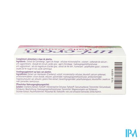 Extract van Veenbessen (Cranberry) (500mg); vulstof: microkristallijn cellulose; kleurstof: calcium carbonaat; antiklontermiddelen: silicon dioxide, vetzuren; glansmiddel: hydroxypropylmethylcellulose; antiklontermidel: magnesiumzouten van vetzuren; groene thee-extract; bevochtingsmiddel: polyethyleenglycol; kleurstoffen: zwarte en rode ijzeroxiden, karmijnzuur.