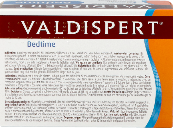 Bent u vergeten Valdispert Bedtime in te nemen? Als u vergeet een tablet in te nemen, moet u de behandeling op het gebruikelijke tijdstip voortzetten. Het is niet erg als u een tablet hebt gemist. Neem geen dubbele dosis in om een vergeten dosis in te halen.