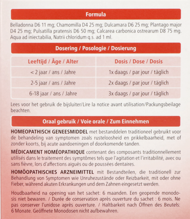 Belladonna D6; Chamomilla D4; Dulcamara D6; Plantago major D4; Pulsatilla pratensis D6; Calcarea carbonica ostrearum D8. Hulpstoffen: Aqua ad iniectabilia, Natrii chloridum.