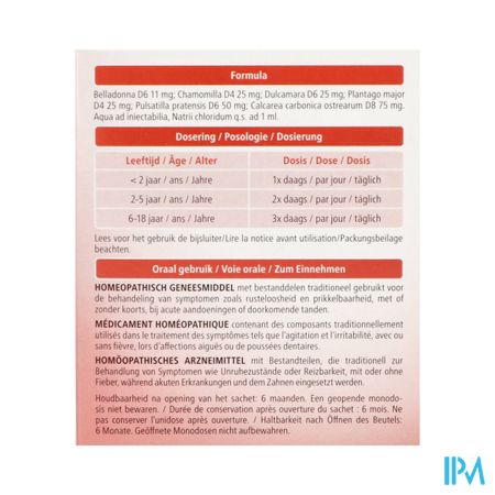Kinderen <2 jaar: 1 monodosis 1x daags. Kinderen 2-5 jaar: 1 monodosis 2x daags. Kinderen en adolescenten 6-18 jaar: 1 monodosis 3x daags. Indien geen verbetering van de symptomen wordt waargenomen binnen de 2 à 3 dagen, dient een arts te worden geraadpleegd.