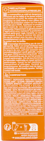 INGREDIËNTEN: AQUA / WATER / EAU - ALCOHOL DENAT. - GLYCERINE - DIISOPROPYL SEBACATE - ISOPROPYL MYRISTATE - ETHYLHEXYL SALICYLATE - ETHYLHEXYL TRIAZONE - SILICA - BIS-ETHYLHEXYLOXYPHENOL METHOXYPHENYL TRIAZINE - BUTYL METHOXYDIBENZOYLMETHAAN - PROPANEDIOL - C12- 22 ALKYLACRYLAAT/HYDROXYETHYLACRYLAAT COPOLYMEER - SILICIUMDIOXIDE SILYLAAT - PERLIET - DROMETRIZOOL TRISILOXAAN - TOCOFEROL - CAPRYL/CAPRIKAANSE TRIGLYCERIDE - ACRYLATEN/C10- 30 ALKYLACRYLAATCROSSPOLYMEER - BUTYLEENGLYCOL - CAPRYLYLGLYCOL - CITROENZUUR - DINATRIUMFOSFAAT - HYDROXYACETOFENON - HYDROXYETHYLCELLULOSE - POLYSORBAAT 60 - NATRIUMFOSFAAT - TEREFTALYLIDEENDICAMPHOR-SULFONZUUR - TRIETHANOLAMINE - TRINATRIUMETHYLEENDIAMINEDISUCCINAAT - PARFUM / GEURSTOF (F.. I.L. N70029734/2).