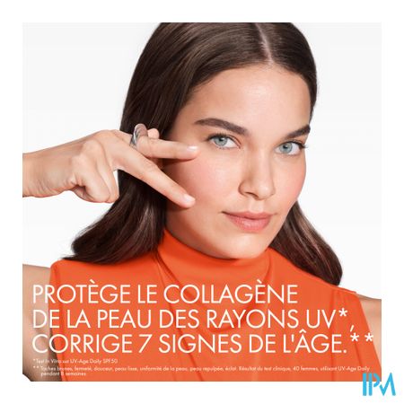- UV-AGE DAILY is de eerste fluïde tegen fotoveroudering van Vichy. De gepatenteerde Netlock-technologie vormt een ultradunne, ultrabestendige en onzichtbare film op de huid voor een zeer hoge bescherming tegen UVB- en UVA-stralen, die verantwoordelijk zijn voor meer dan 80% van de tekenen van huidveroudering.