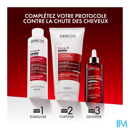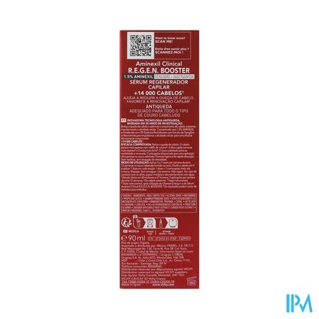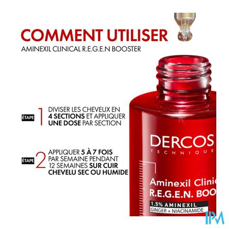 Vichy Dercos Aminexil Clinical R.E.G.E.N. Booster Serum is een geavanceerd haarserum dat haaruitval helpt verminderen en de haargroei stimuleert*. De formule combineert 1,5% Aminexil met gemberextract en niacinamide voor een dubbele werking: het ondersteunt de verankering van het haar in de hoofdhuid en bevordert een gezonde haargroei*. Het serum versterkt de haarvezel, geeft meer volume en glans, en draagt bij aan een vollere haardos. Geschikt voor dagelijks gebruik op droog of vochtig haar, voor zichtbaar sterker en vitaler haar. Vichy Dercos Aminexil Clinical R.E.G.E.N. Booster Serum biedt een gerichte aanpak bij haaruitval en dunner wordend haar. De combinatie van Aminexil, gemberwortel en niacinamide helpt de haarwortel te beschermen, stimuleert de hoofdhuid en ondersteunt de natuurlijke haargroei. Dit anti-haaruitval serum voedt en versterkt het haar vanaf de aanzet, waardoor het er voller en gezonder uitziet. Voor het beste resultaat wordt aangeraden het product 5 tot 7 keer per week aan te brengen, verdeeld over vier secties van de hoofdhuid. Ideaal in combinatie met Dercos shampoo voor een complete haarverzorgingsroutine. *Bestaand haar.