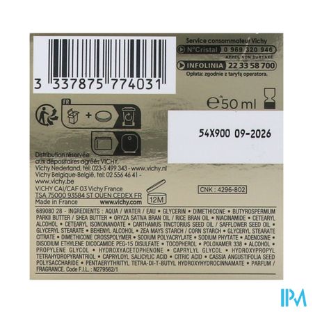 Ingrediënten: Aqua/eau/water - glycerine - dimethicone - butyrospermum parkii boter / karitéboter - oryza sativa zemelenolie / rijstbrandolie - niacinamide - cetearyl alcohol - cetearyl isononanoaat - Carthamus tinctorius zaadolie / saffloer zaadolie - flycerylstearaat - behenylalcohol - zea mays zetmeel / maïszetmeel - glycerylstearaat citraat - dimethicone crosspolymeer - natriumpolyacrylaat - natriumfytaat - adenosine - dinatriumethyleendicocamide peg- 15 disulfaat - tocoferol - poloxamer 338 - alcohol - propyleenglycol - hydroxyacetofenon - caprylyl glycol - hydroxypropyl tetrahydropyrantriol - capryloyl salicylzuur - citroenzuur - cassia angustifolia zaad polysaccharide - pentaerythrityl tetra-di-t-butyl hydroxyhydrocinnamiate - parfum / geurstof. Code F.I.L. : N279562/1