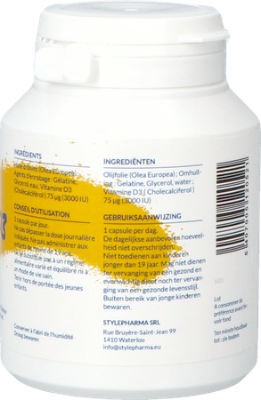 Olijfolie (Olea Europea); Omhulling : Gelatine, Glycerol, water ; Vitamine D3 ( Cholecalciferol ) 75 µg (3000 IU)