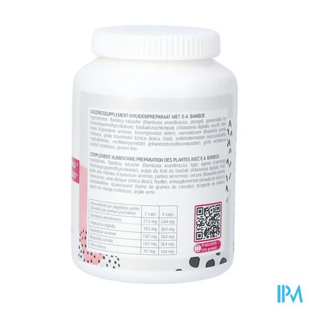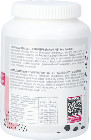 Droogextracten van Aziatische bamboestengel (Bambusa arundinacea), vruchten van de Afrikaanse baobab (Adansonia digitate), heermoeskruid (Equisetum arvense), blad van de grote brandnetel (Urtica dioica) en hars van de bast van de wierookboom (Boswellia serrata)