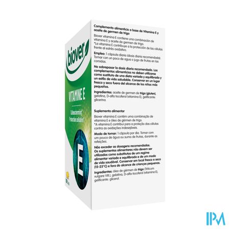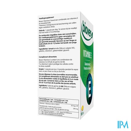 Biover Vitamine E bevat een combinatie van vitamine E en tarwekiemolie. [1]Vitamine E draagt bij tot de bescherming van cellen tegen oxidatieve stress.