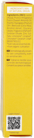 Water, amandelolie, pindaolie, bijenwas, alcohol, glyceryloleaat, compositie van natuurlijke etherische oliën, sorbitan olivate, zinksulfaat, limoneen, linalool, citronellol, geraniol, citral.