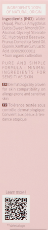 Water (Aqua) - Prunus Amygdalus Dulcis (Sweet Almond) Oil - Alcohol - Glyceryl Stearate SE - Hydrolyzed Beeswax - Prunus Domestica Seed Oil - Glycerin - Xanthan Gum - Lactic Acid.