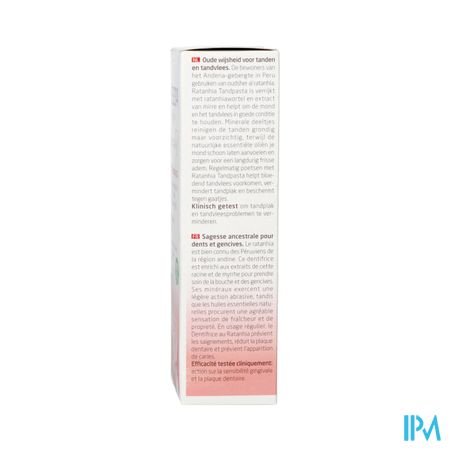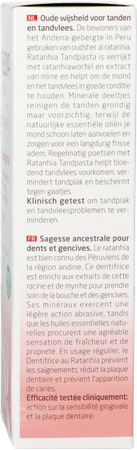 Ratanhia Tandpasta maakt het tandvlees sterk en stevig en trekt het samen rond de tandwortel. Bij goed poetsen met Ratanhia Tandpasta krijgt tandplak geen kans. Als het tandvlees rood en gevoelig is, werken Ratanhia en mirre zuiverend. Aan de tandpasta zijn geen fluoride en synthetische schuimmiddelen toegevoegd.