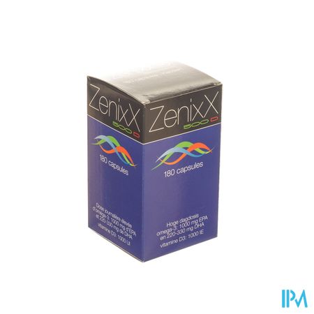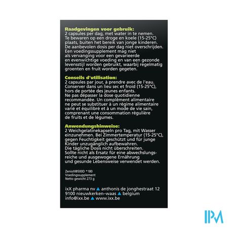 Zenixx 500 D Caps 180 is een voedingssupplement, verkrijgbaar in uw buurtapotheek of online apotheek. Neem niet meer dan de aanbevolen dagelijkse dosis vermeld op de verpakking. Het vervangt geen gezonde levensstijl en gevarieerde en evenwichtige voeding. Vraag raad aan uw apotheker. Het product altijd buiten het bereik van kinderen houden.