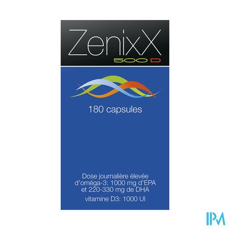 2 zachte capsules ZenixX 500 D bevatten minstens 1000 mg EPA (gemiddeld 1050 mg), 320 mg DHA en 1000 IE vitamine D3 (25 µg).
