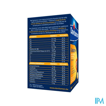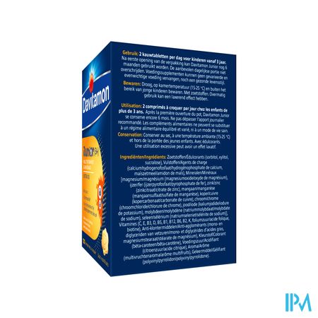 2 comprimés à croquer par jour pour les enfants à partir de 3 ans. Après la première ouverture de l'emballage, Davitamon Junior peut être utilisé pendant encore 6 mois. Ne pas dépasser la portion journalière recommandée. Les compléments alimentaires ne peuvent pas remplacer une alimentation variée et équilibrée, ni un mode de vie sain.