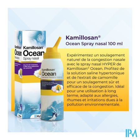 Kamillosan® Ocean Neusspray is een isotone oplossing die zeewater bevat met natuurlijke zeezouten, gezuiverd water alsook kamille-extract als geurstof.