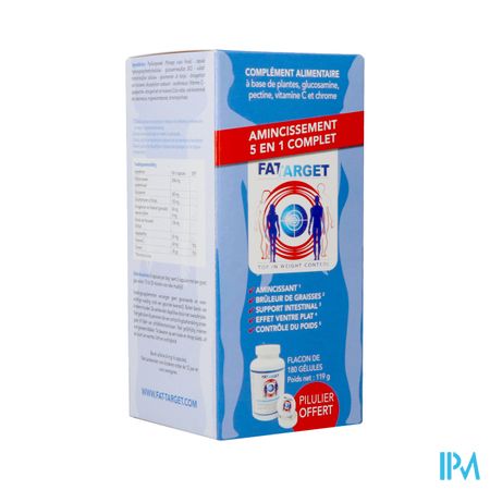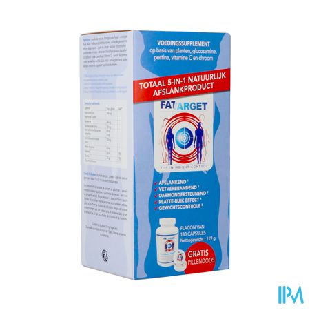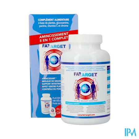 Fat Target Caps 180 is een voedingssupplement, verkrijgbaar in uw buurtapotheek of online apotheek. Neem niet meer dan de aanbevolen dagelijkse dosis vermeld op de verpakking. Het vervangt geen gezonde levensstijl en gevarieerde en evenwichtige voeding. Vraag raad aan uw apotheker. Het product altijd buiten het bereik van kinderen houden.