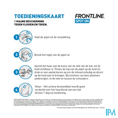 Frontline® Spot-On is een gemakkelijk aan te brengen vloeistof die uw kat goede bescherming tegen vlooien en teken biedt. Frontline® Spot-On doodt vlooien binnen 24u en teken binnen 48u. Het beschermt je kat 2 weken tegen teken en 4 weken tegen vlooien.