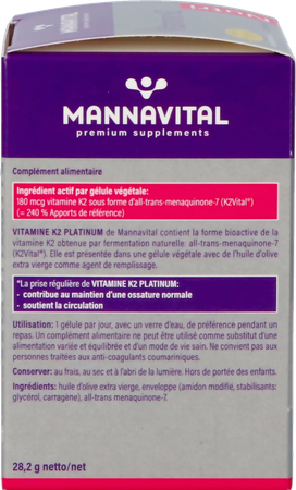 - 180 mcg vitamine K2 onder de vorm van all-trans-menaquinone-7 (K2Vital®) (= 240 % Referentie-inname)