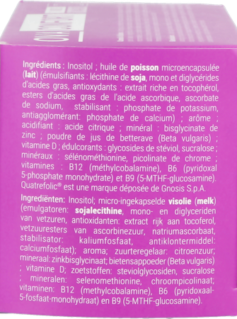 Inositol; micro-ingekapselde visolie (melk) (emulgatoren: sojalecithine, mono- en diglyceriden van vetzuren, antioxidanten: extract rijk aan tocoferol, vetzuuresters van ascorbinezuur, natriumascorbaat, stabilisator: kaliumfosfaat, antiklontermiddel: calciumfosfaat); aroma; zuurteregelaar: citroenzuur; mineraal: zinkbisglycinaat; bietensappoeder (Beta vulgaris) ; vitamine D; zoetstoffen: steviolglycosiden, sucralose ; mineralen: selenomethionine, chroompicolinaat; vitaminen: B12 (methylcobalamine), B6 (pyridoxaal-5-fosfaat-monohydraat) en B9 (5-MTHF-glucosamine).