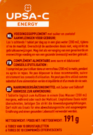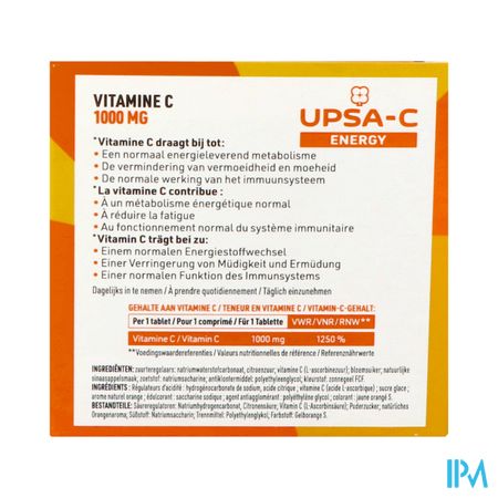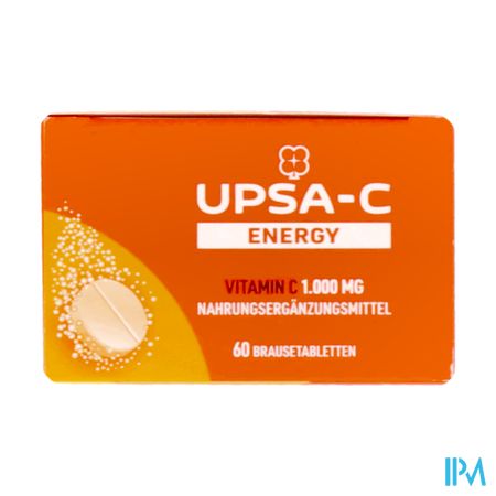 Upsa C Energy 1000mg Bruistabl 60 is een voedingssupplement, verkrijgbaar in uw buurtapotheek of online apotheek. Neem niet meer dan de aanbevolen dagelijkse dosis vermeld op de verpakking. Het vervangt geen gezonde levensstijl en gevarieerde en evenwichtige voeding. Vraag raad aan uw apotheker. Het product altijd buiten het bereik van kinderen houden.