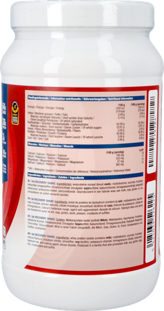 weiproteïne-isolaat (bevat melk) [weiproteïne-isolaat (bevat melk), emulgator: sojalecithine]; maltodextrine; sucrose; fructose; natuurlijke smaakstoffen; trinatriumcitraat; kaliumchloride; trimagnesiumcitraat; antiklontermiddel: siliciumdioxide. Kan sporen van gluten, ei, aardnoten en verschillende soorten noten en zaden bevatten.