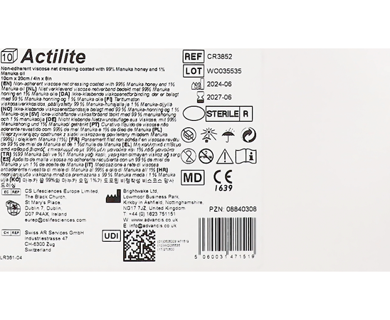 Actilite is een licht viscose net verband gecoat met antibacteriële Manuka honing en Manuka olie. Dit wondverband is ontwikkeld om te beschermen, genezing te bevorderen en exsudaat te laten passeren. Het antibacteriële effect van Actilite is versterkt door geconcentreerde Manuka olie te combineren met Manuka honing. Deze combinatie van Manuka honing en Manuka olie is bewezen in-vitro effectief te zijn tegen een aantal grote wond infecterende organismen zoals MRSA, VRE en Providentia stuartii.